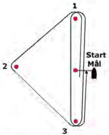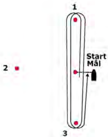 Signaliseres med signalflagg W og på onsdager er start og mål samme linje. I andre regattaer kan det være forskjellig start og mållinje. Banen skal seiles mot toppmerket (1) tilbake til bunnmerket (3) to ganger.
